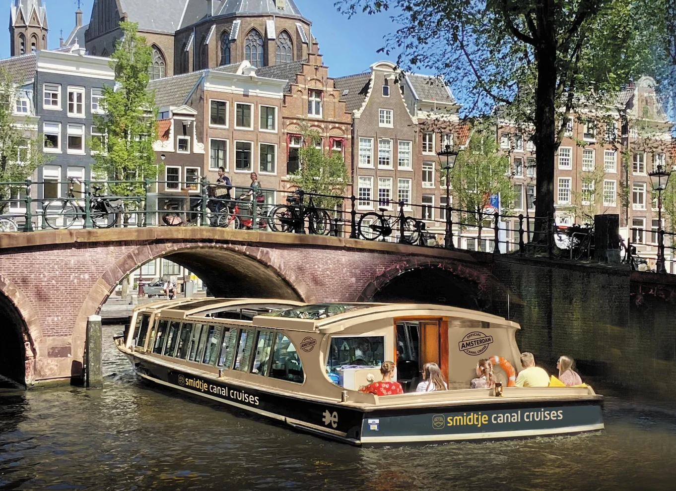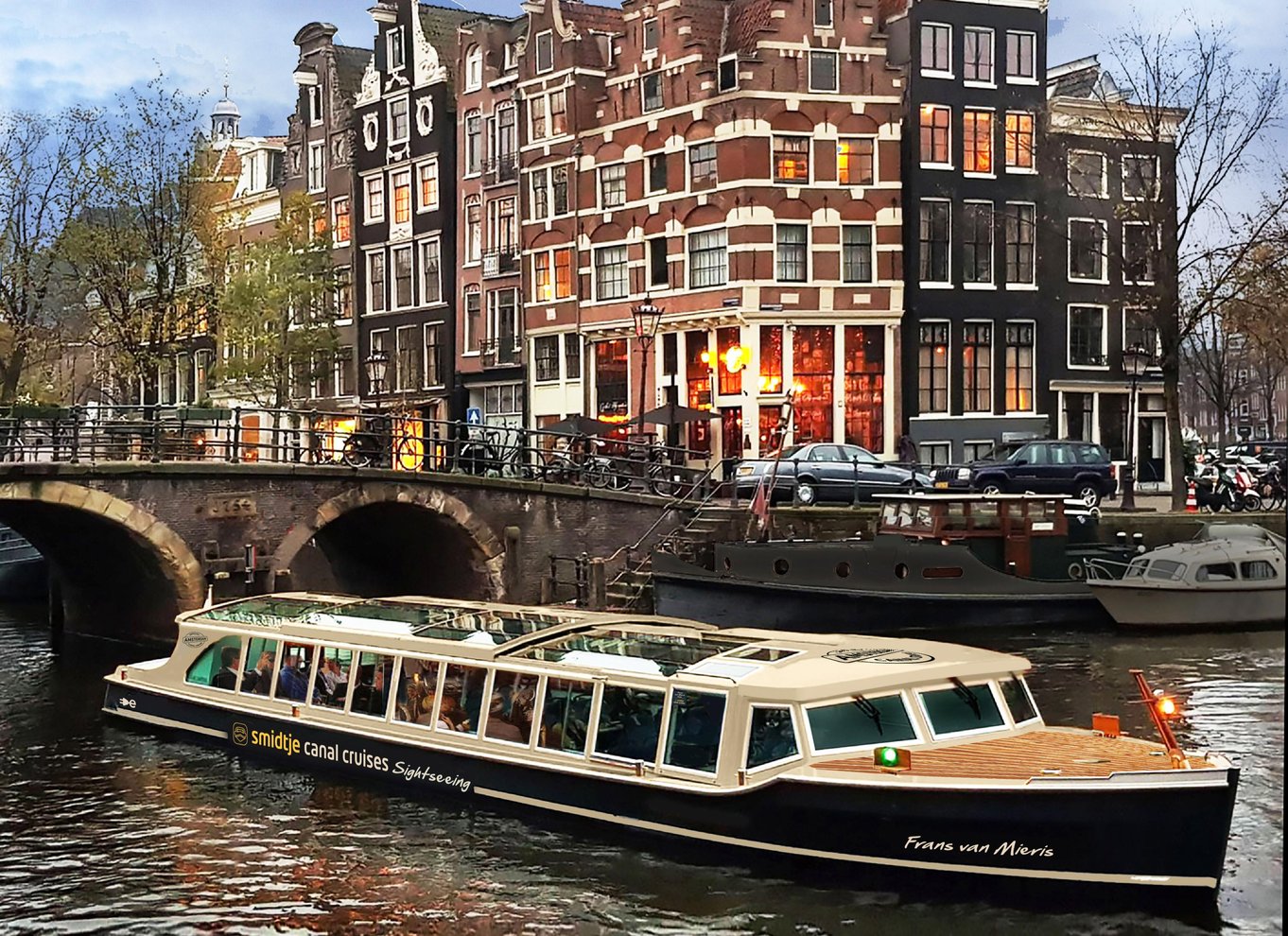Step aboard the city's finest cruise just by the Anne Frank House. At our café: Smidtje Canal Café Dialoog you get to start your cruise experience exclusively, with the option to consume drinks and snacks upon departure or after the cruise. In 1 hour, you get to discover Amsterdam from the comfort of your seat. Cruise amongst others past the Nine Streets, Herengracht, Skinny Bridge, Maritime Museum, Central Station, the old neighborhood Jordaan and the IJ river. From our photo deck you get to capture the most stunning photos.