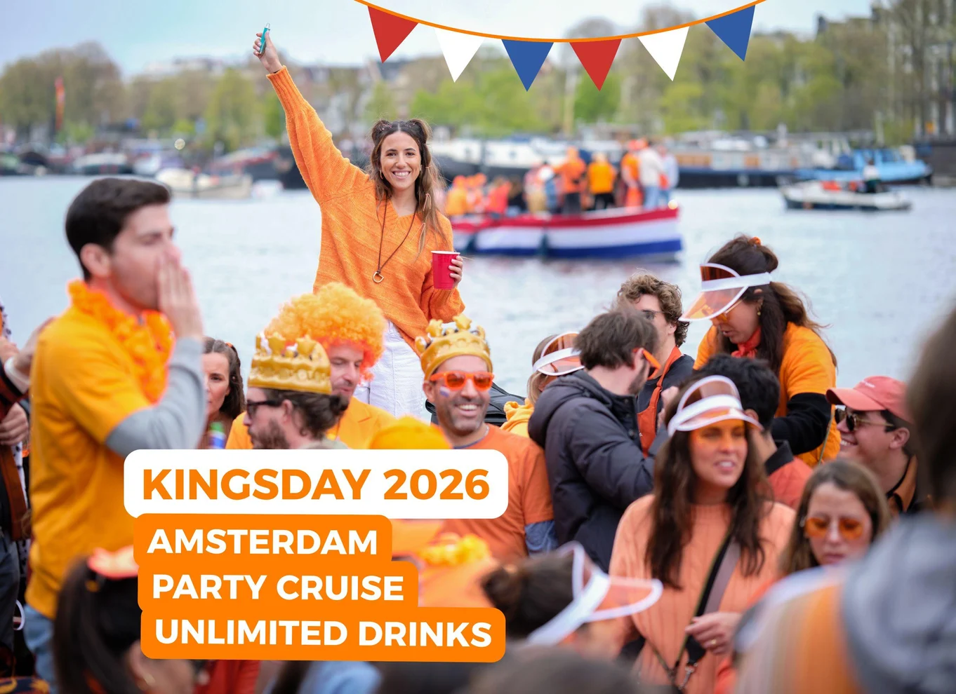 Feiere den Königstag in Amsterdam auf einer Grachtenrundfahrt mit Musik und unbegrenzten Bier-, Wein- und Softdrinks. Bewundere die Sehenswürdigkeiten der Stadt vom Wasser aus, während ein einheimischer Kapitän am Steuer sitzt.