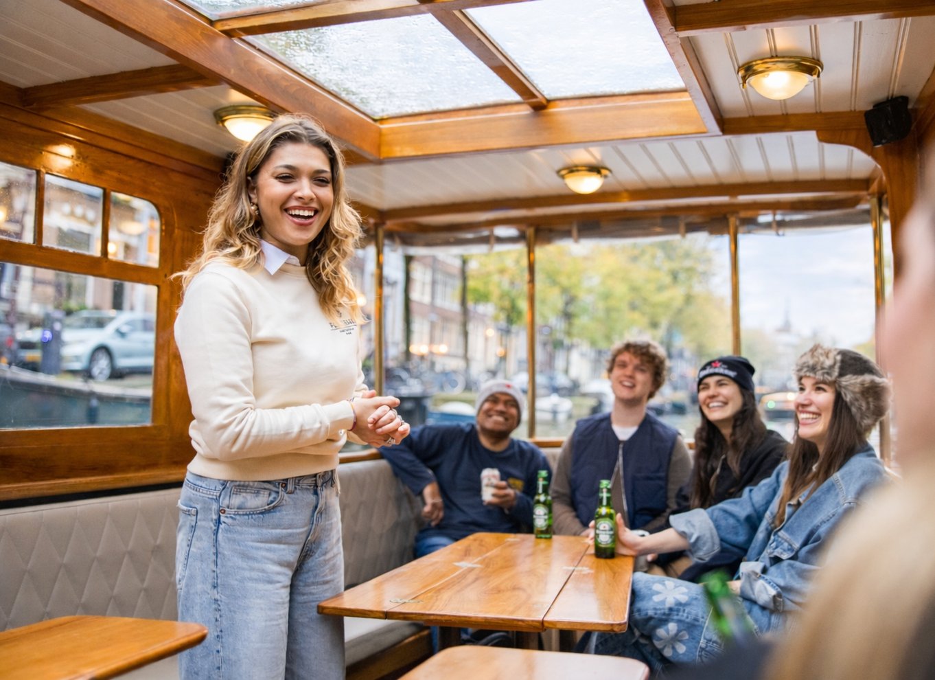 A nagyobb turistahajóktól eltérően ezek a klasszikus szalonhajók meghittebb és kényelmesebb hangulatot kínálnak. A fedett szalonban minden időjárási körülmény között kényelmesen érzed magad, napos napokon pedig felnyithatjuk a tetőt, hogy teljes mértékben élvezhesd Amszterdam csatornáit.